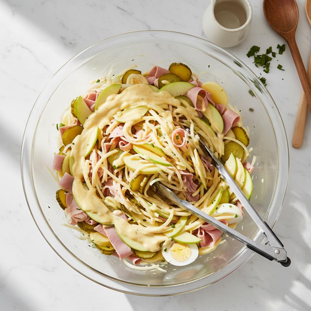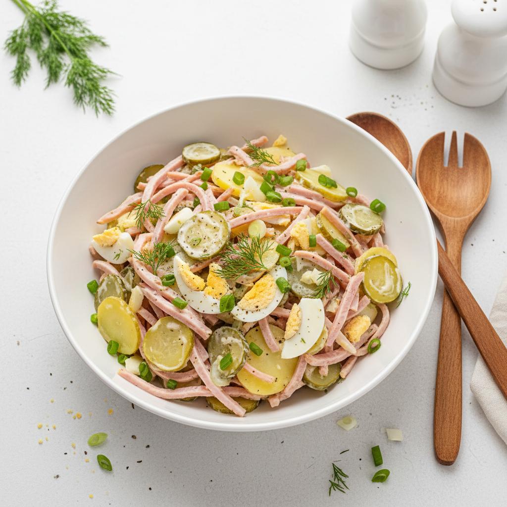Нежный и сытный салат сочетает кубики отварного картофеля и яиц с пикантной ветчиной и свежими огурцами. Всё это объединяет лёгкая заправка на основе сметаны с яркими нотками горчицы и лимонного сока. Это классическая комфортная еда, которая всегда уместна на семейном столе.